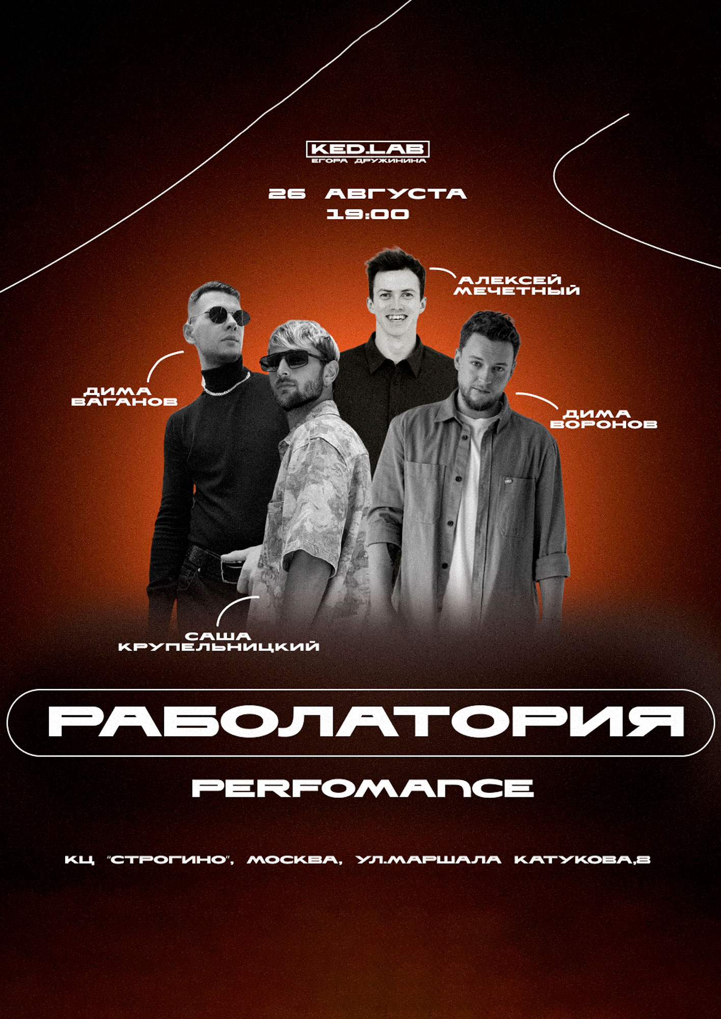 «Раболатория» – это уникальная постановка, созданная объединением творческих людей! В течение 5 дней ученики лаборатории Егора Дружинина готовили перфомансы в области авторской хореографии под чутким руководством таких наставников как: Лёша Мечетный, Саша Крупельницкий, Дима Ваганов и Дима Воронов!